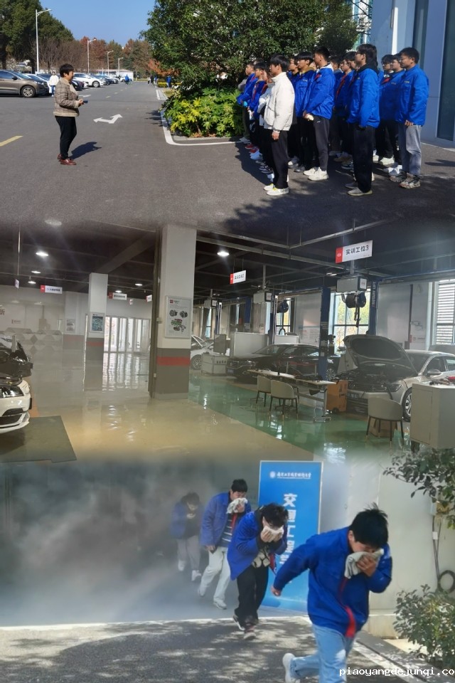 随着一阵急促的警报声,“消防安全疏散应急演练”拉开了帷幕,一股浓烟中,实训室同学们按照预案在老师的引导下,沉着冷静、行动迅速,按照“弯腰、捂鼻、靠墙走”的七字逃生要诀,迅速沿安全通道撤离至广场中央安全地带。任课老师在安全通道中途指挥提醒同学们保持秩序,最终在广场清点人数无误汇报至学院。