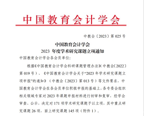 中国教育会计学会为全国专业性一级学会,此次学术研究课题面向全体会员单位组织开展,经审查和公示后共立项171项,其中,重点研究课题26项,面上研究课题145项。csgo直播比赛官方平台获批3项,立项数量并列全国会员单位第七位。