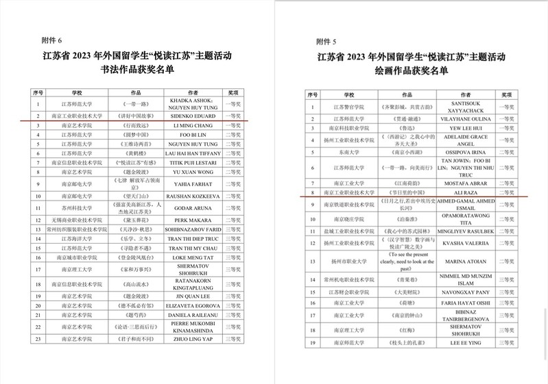 为深入贯彻落实习近平总书记给南京审计大学留学生回信精神,鼓励广大留学生感知和热爱中国文化,近日,我校国际教育学院组织了外国留学生参加由江苏省教育厅主办、江苏省高等教育学会外国留学生教育管理研究委员会协办的2023年外国留学生“悦读江苏”主题活动,来自俄罗斯的留学生SIDENKO EDUARD的书法作品《讲好中国故事》获得书法作品类一等奖第一名,来自巴基斯坦的留学生ALI RAZA的作品《节日里的中国》获得绘画作品类二等奖。