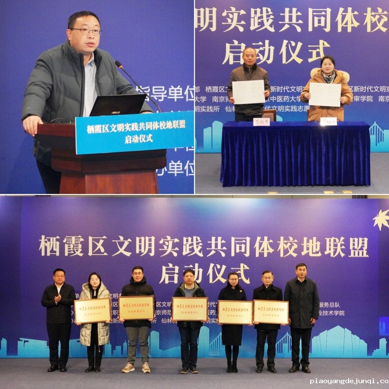 活动现场,南京市委宣传部副部长、南京市文明办主任经地生,栖霞区委常委、宣传部部长袁文峰共同为首批“栖霞区文明实践共同体校地联盟单位”授牌。栖霞区文明办主任吴国罡介绍“文明实践共同体校地联盟”工作具体情况;我校航空工程学院院长黄杰就本单位科技科普的文明实践项目开展情况进行介绍。联盟高校、结对社区新时代文明实践站相关负责同志签订合作协议书。我校航空工程学院副院长张琪与羊山湖社区签订合作协议书。