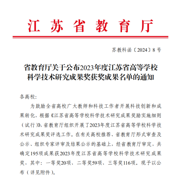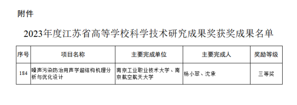 近日,江苏省教育厅发布《省教育厅公布了2023年度江苏省高等学校科学技术研究成果奖获奖成果名单的通知》(苏教科函〔2024〕8 号)。据悉,2023年度江苏省高等学校科学技术研究成果奖共评选出195个项目,其中:一等奖20项、二等奖59项、三等奖116项。我校工程技术实训中心杨小翠老师团队申报的《噪声污染防治用声学超结构机理分析与优化设计》科研成果获得三等奖。