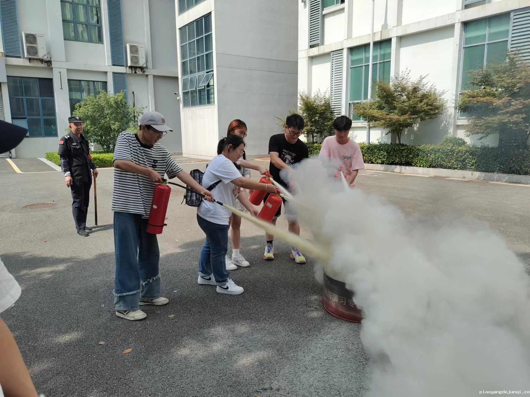现场演练阶段,同学们根据预案在老师的引导下,沉着冷静、行动迅速,按照“弯腰、捂鼻、靠墙走”的七字逃生要诀,迅速从楼上撤离至广场中央安全地带。灭火演练环节中,同学们按照“一晃、二拉、三喷,站在上风口,对准火源根部喷”等动作要领,分组进行灭火,大家相互配合,快速有序地扑灭火情。