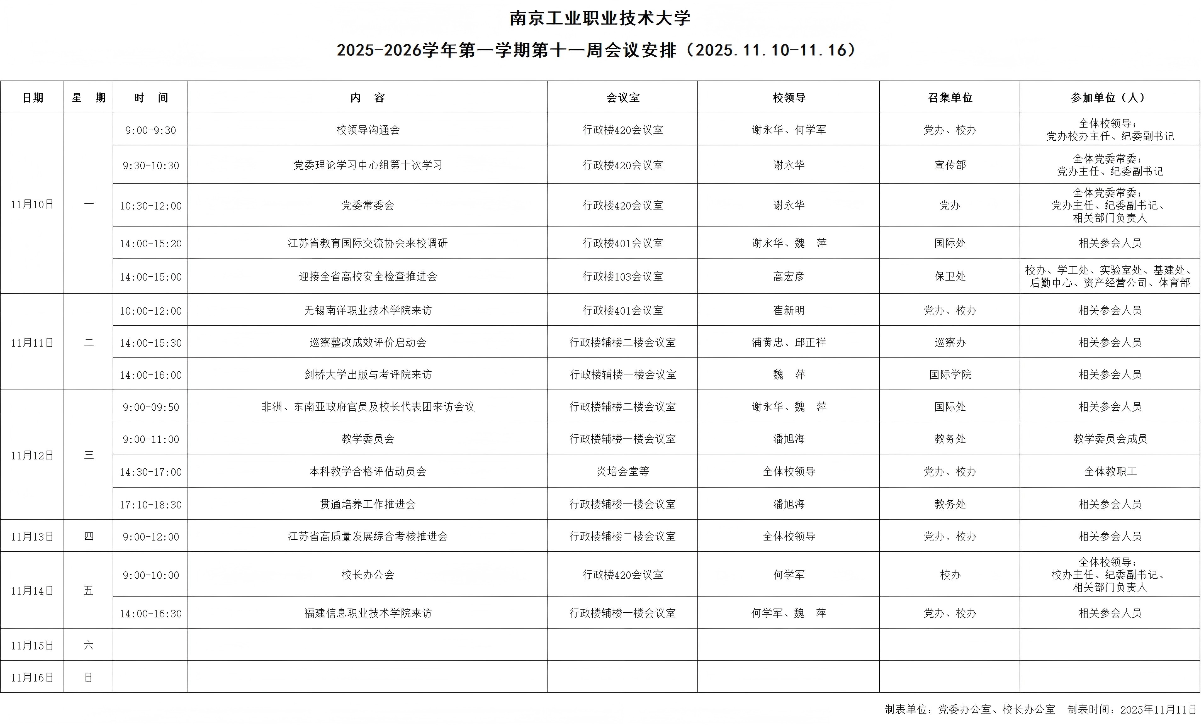 2025-2026学年第一学期第十一周会议安排(2025.11.10-11.16)