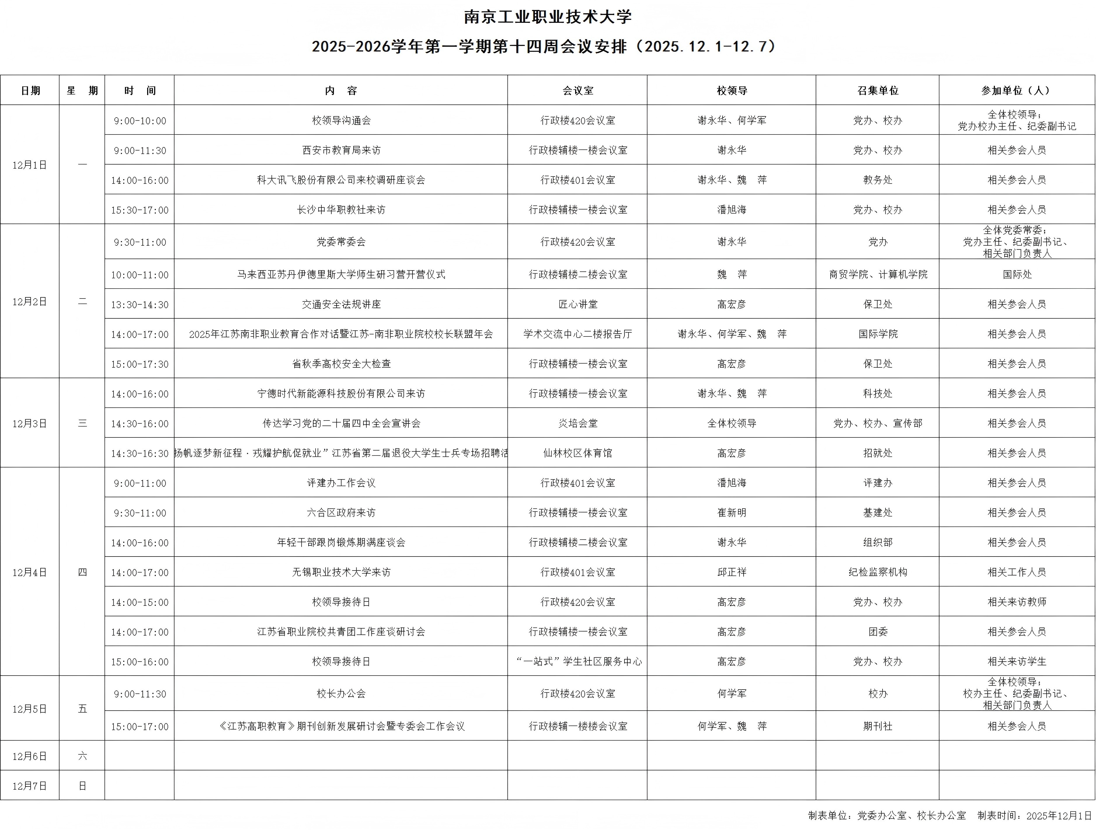 2025-2026学年第一学期第十四周会议安排(2025.12.1-12.7)