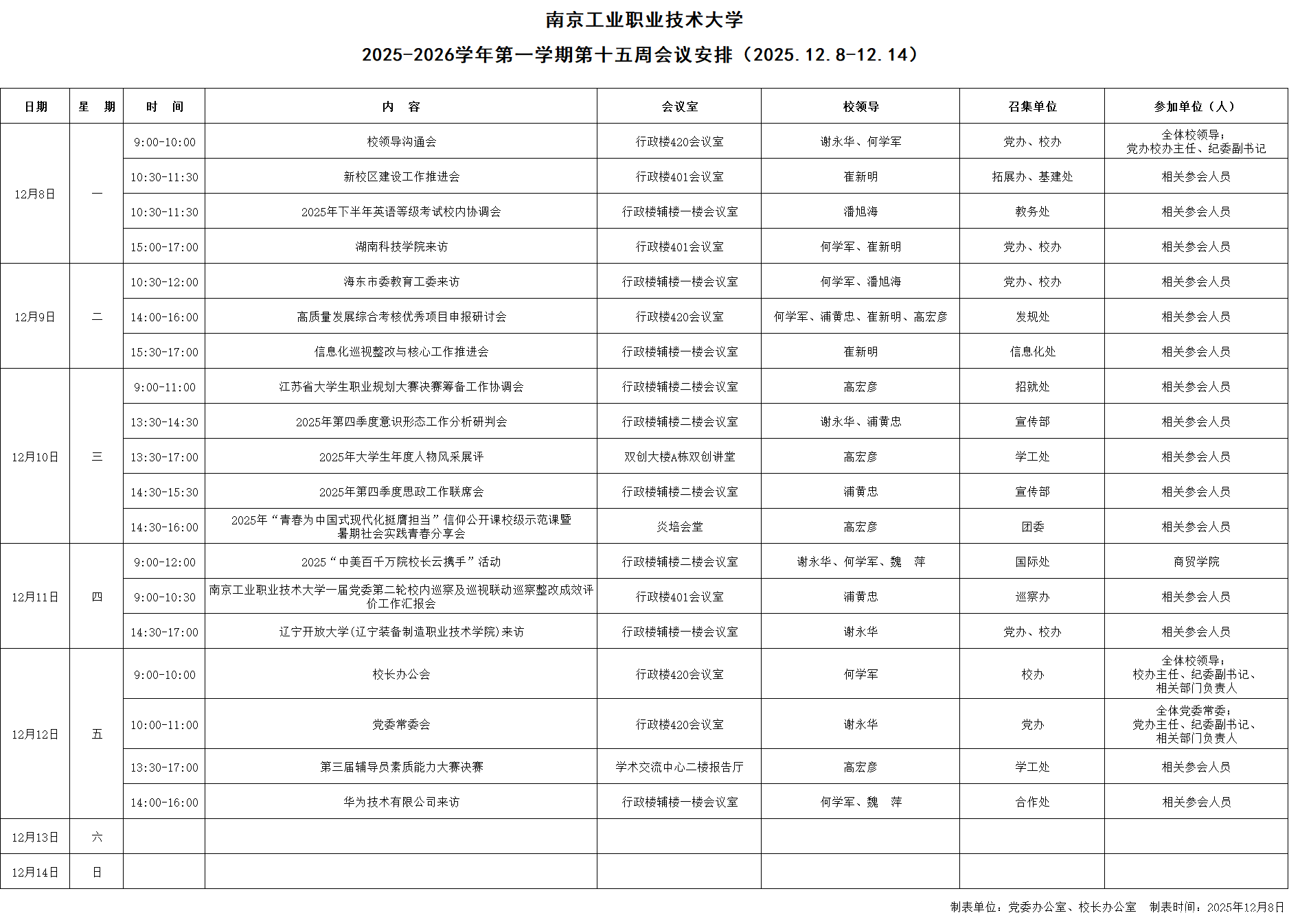 2025-2026学年第一学期第十五周会议安排(2025.12.8-12.14)