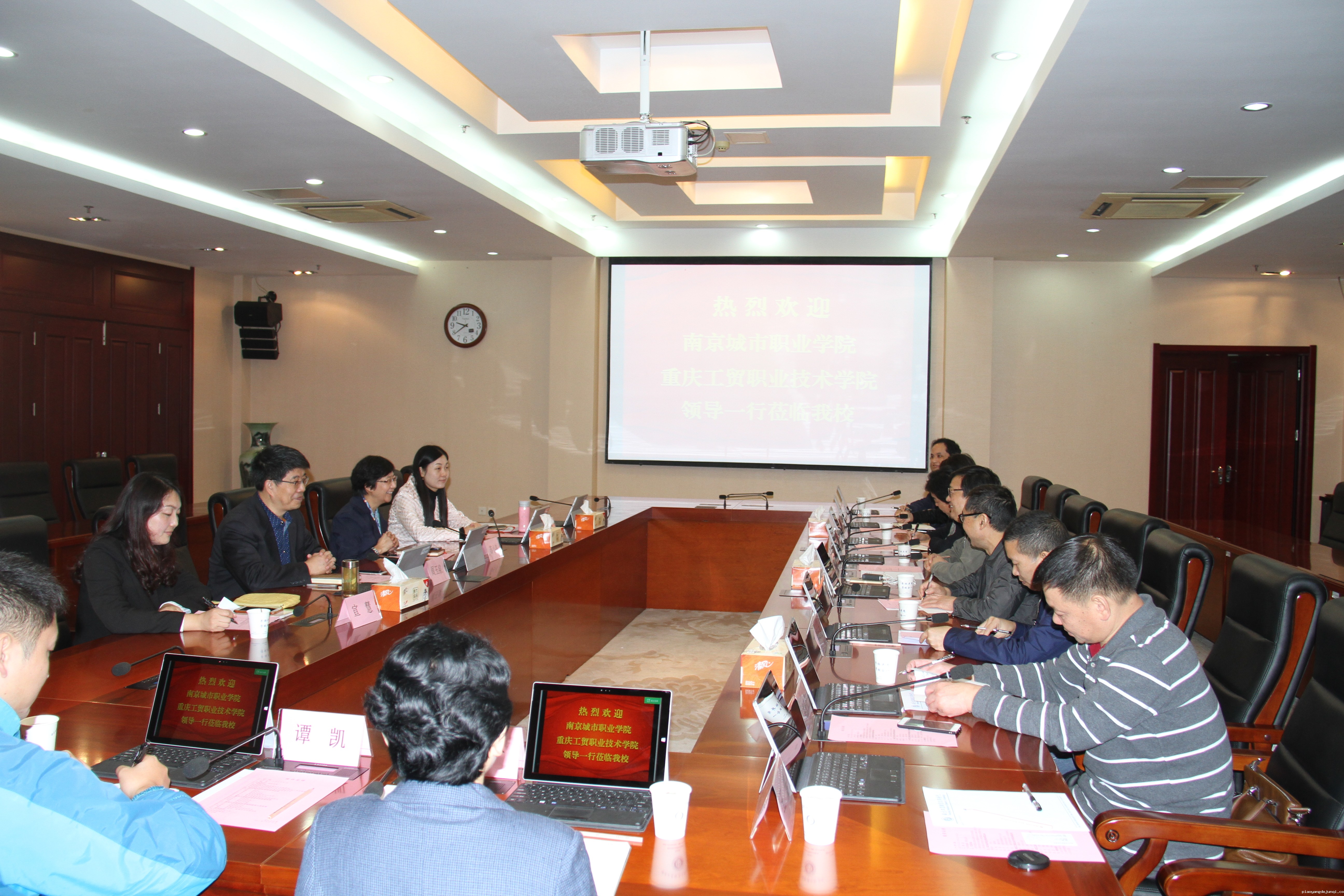 10月19日上午,南京城市职业学院陈社育校长与重庆工贸职业技术学院彭光辉副院长率领相关部门负责同志来我校进行工作交流。我校苏小冬党委副书记以及教务处、质量监控与评估处、科技处、发展合作处等部门负责同志接待了来宾。