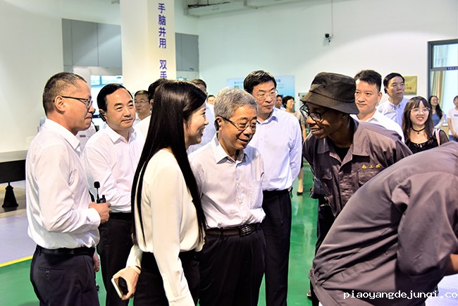在国家双创示范基地和产教融合基地,陈宝生参观了学校大学生科技创新作品展,与科创达人亲切交谈,认真听取了各项科创作品的介绍,对围绕社会需求和实际问题开展科技创新的学生成果表示赞许。他深入教学实训一线,实地走访产教融合先进制造实训基地,考察了智能制造综合实训中心、先进数控技术实训中心、比亚迪新能源汽车实训中心、航空机电综合实训中心和城轨机电综合实训中心。陈宝生肯定了我校在产教融合方面所做出的努力,并提出,校企合作就是要建立基于技术发展革新的命运共同体。