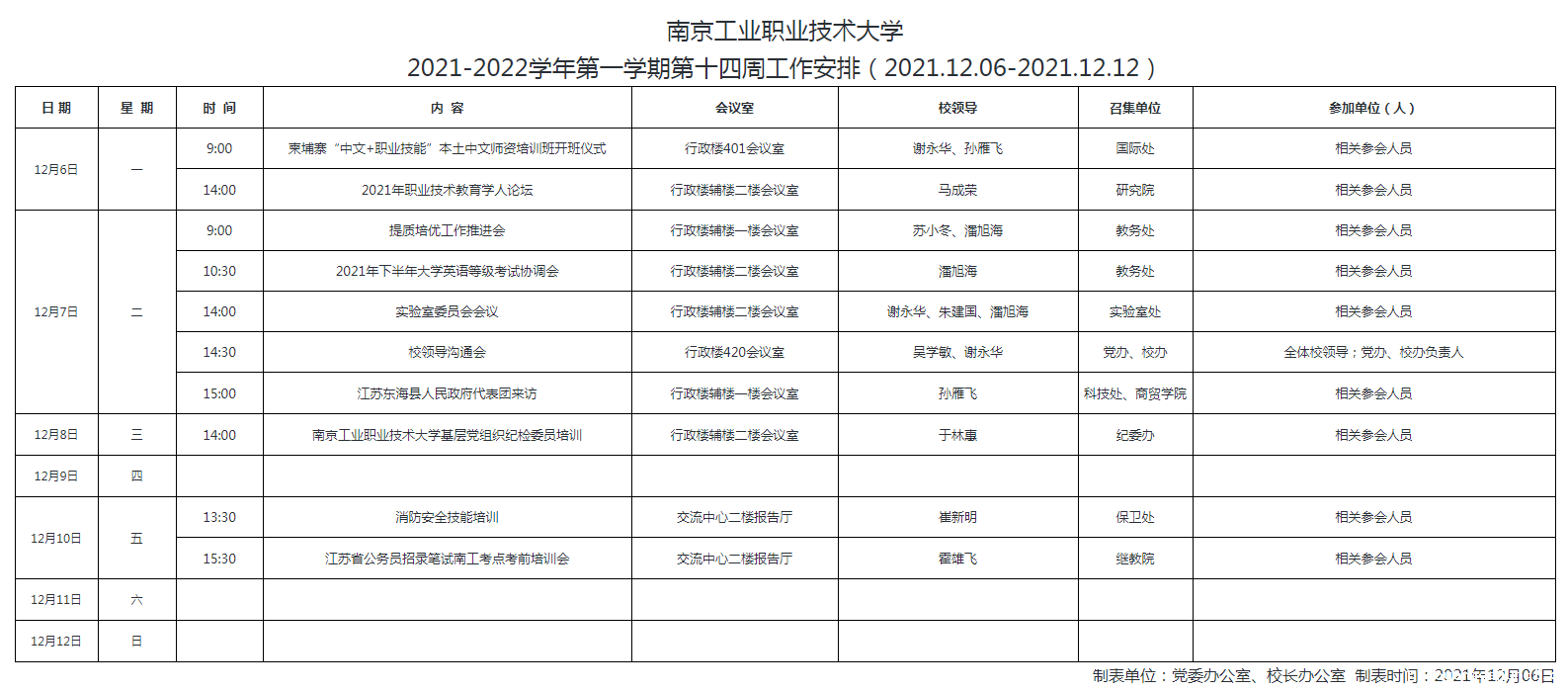 2021-2022学年第一学期第十四周工作安排(2021.12.06-2021.12.12)