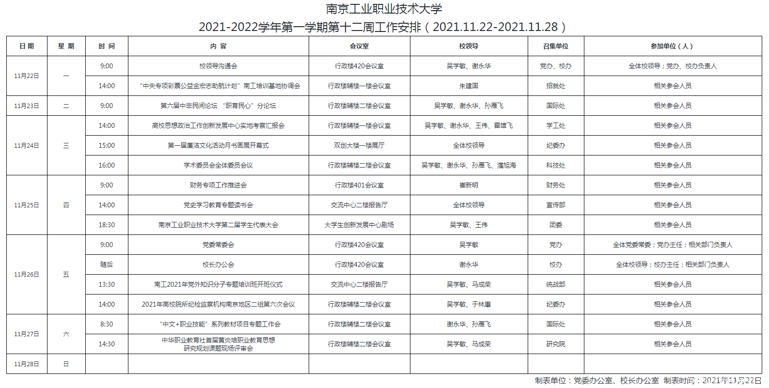 2021-2022学年第一学期第十二周工作安排(2021.11.22-2021.11.28)