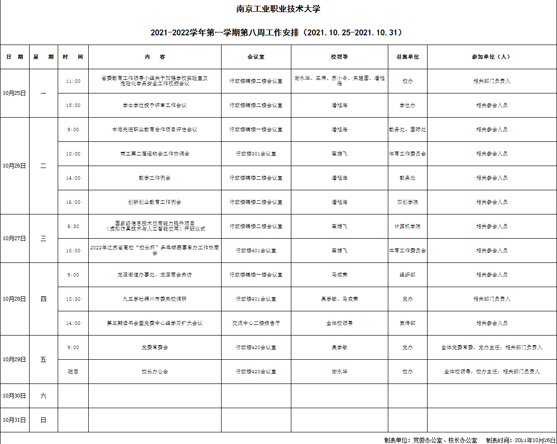 2021-2022学年第一学期第八周工作安排(2021.10.25-2021.10.31)