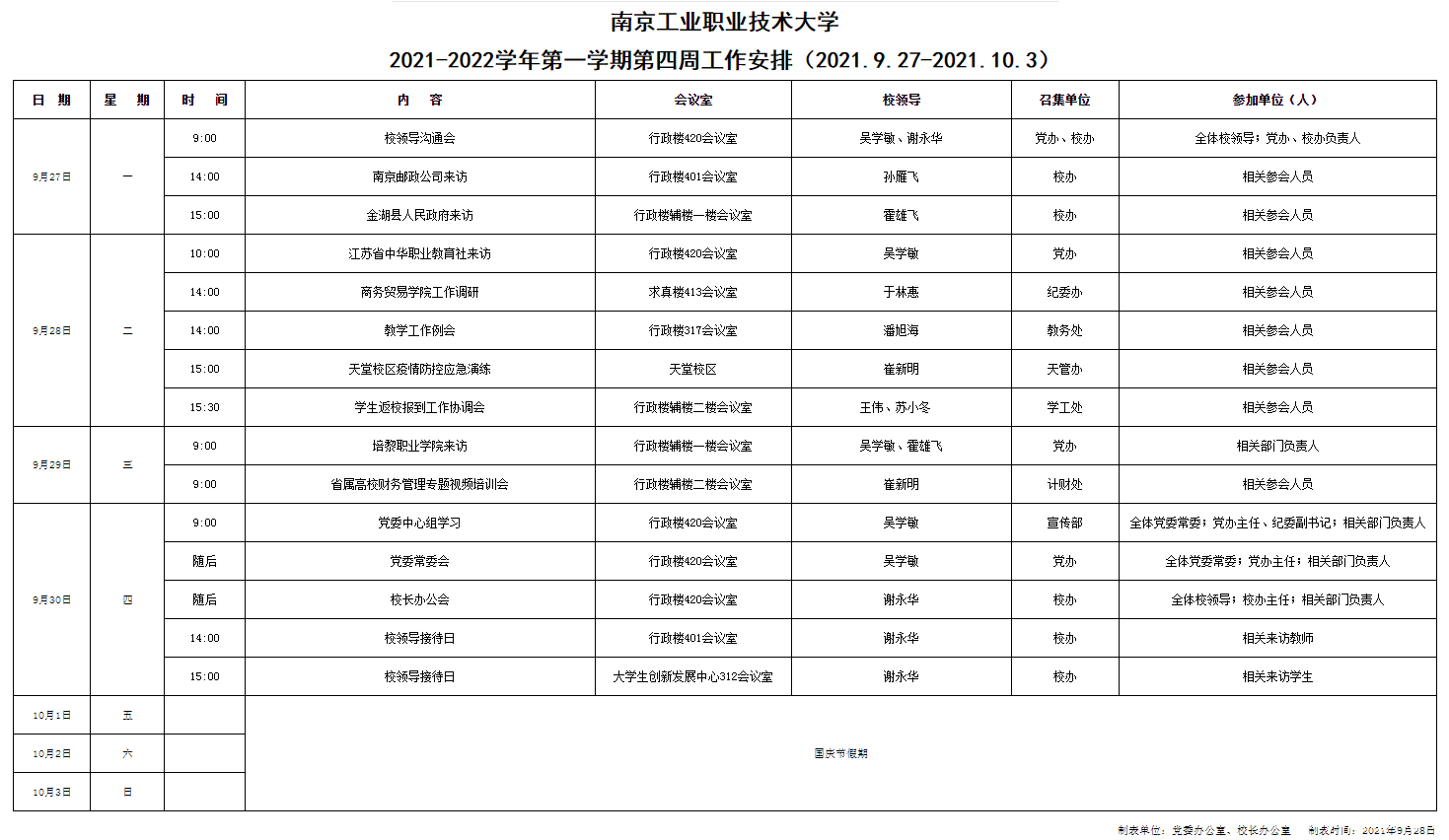 2021-2022学年第一学期第四周工作安排(2021.9.27-2021.10.3)