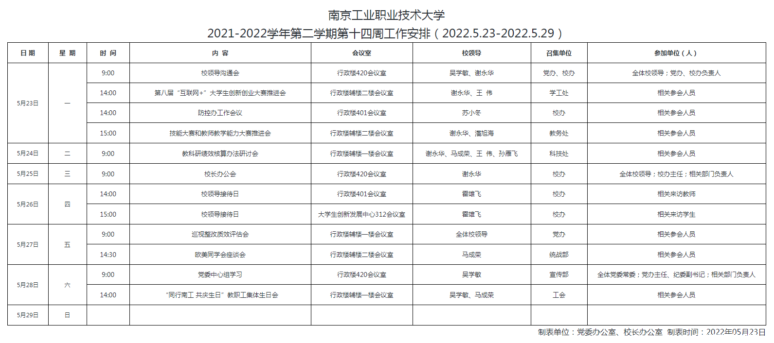 2021-2022学年第二学期第十四周工作安排(2022.5.23-2022.5.29)