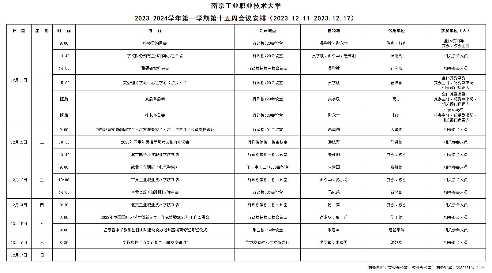 2023-2024学年第一学期第十五周会议安排(2023.12.11-2023.12.17)
