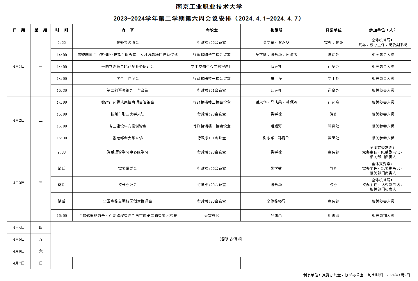 2023-2024学年第二学期第六周会议安排(2024.4.1-2024.4.7)