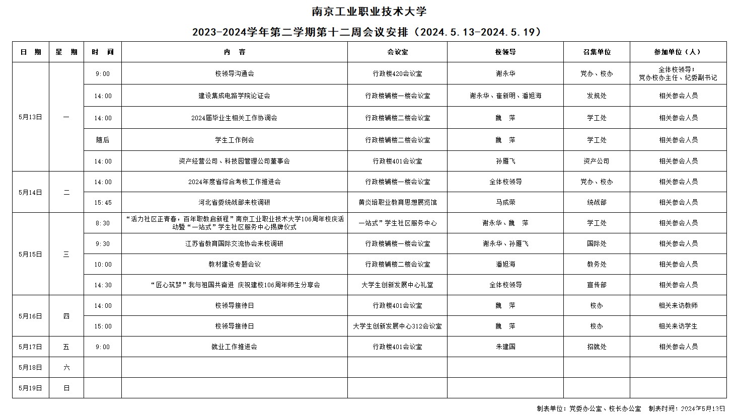 2023-2024学年第二学期第十二周会议安排(2024.5.13-2024.5.19)