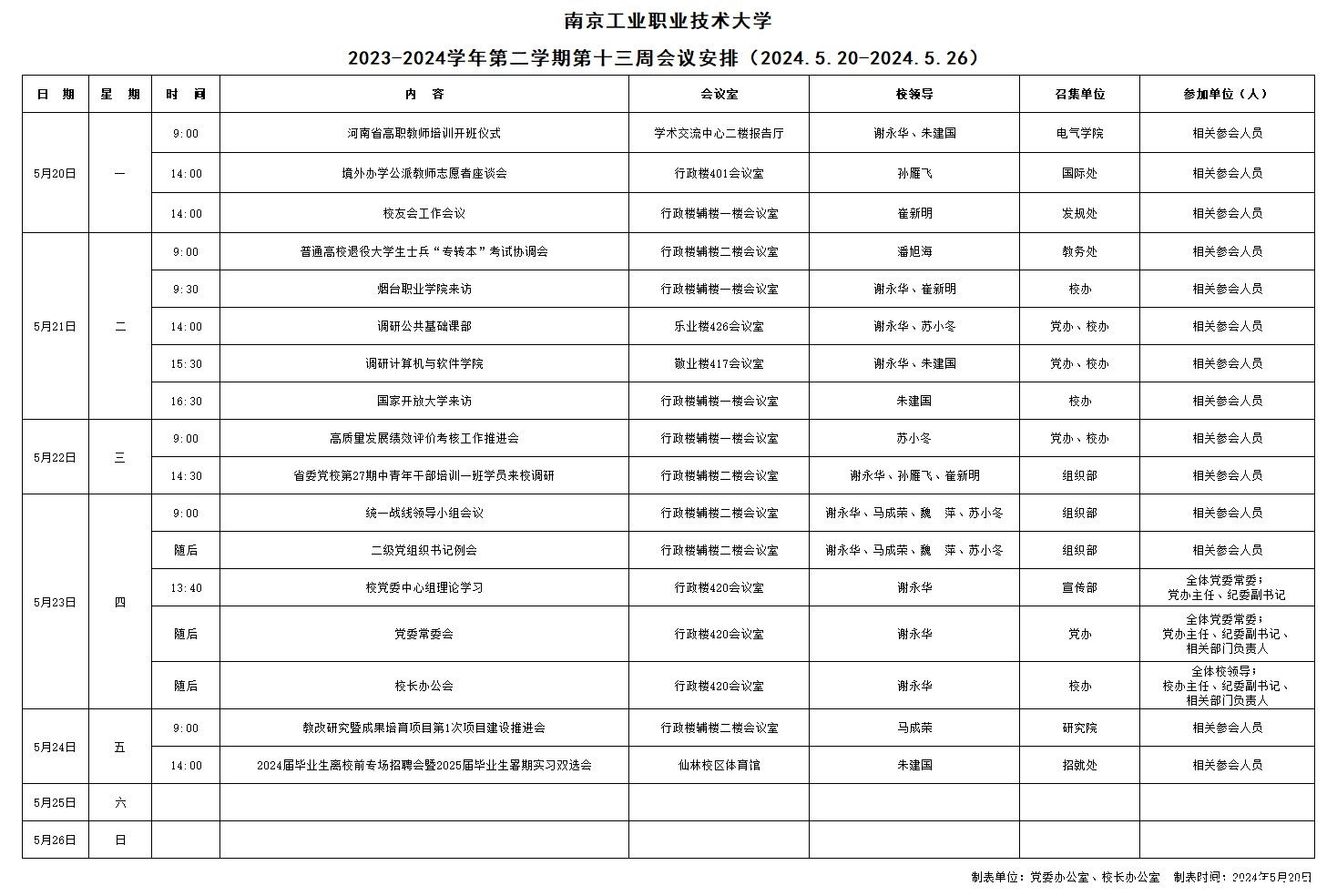 2023-2024学年第二学期第十三周会议安排(2024.5.20-2024.5.26)