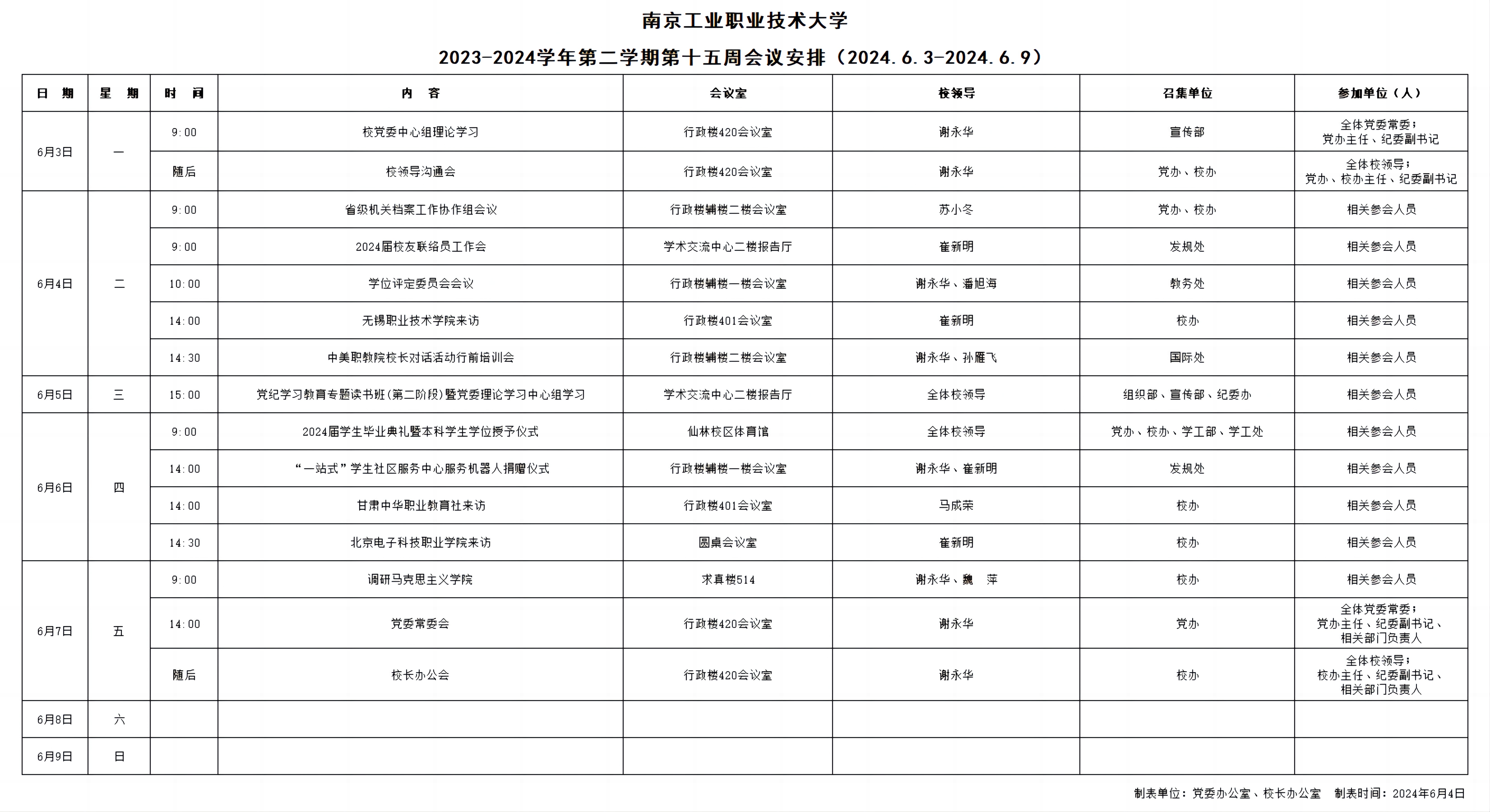 2023-2024学年第二学期第十五周会议安排(2024.6.3-2024.6.9)