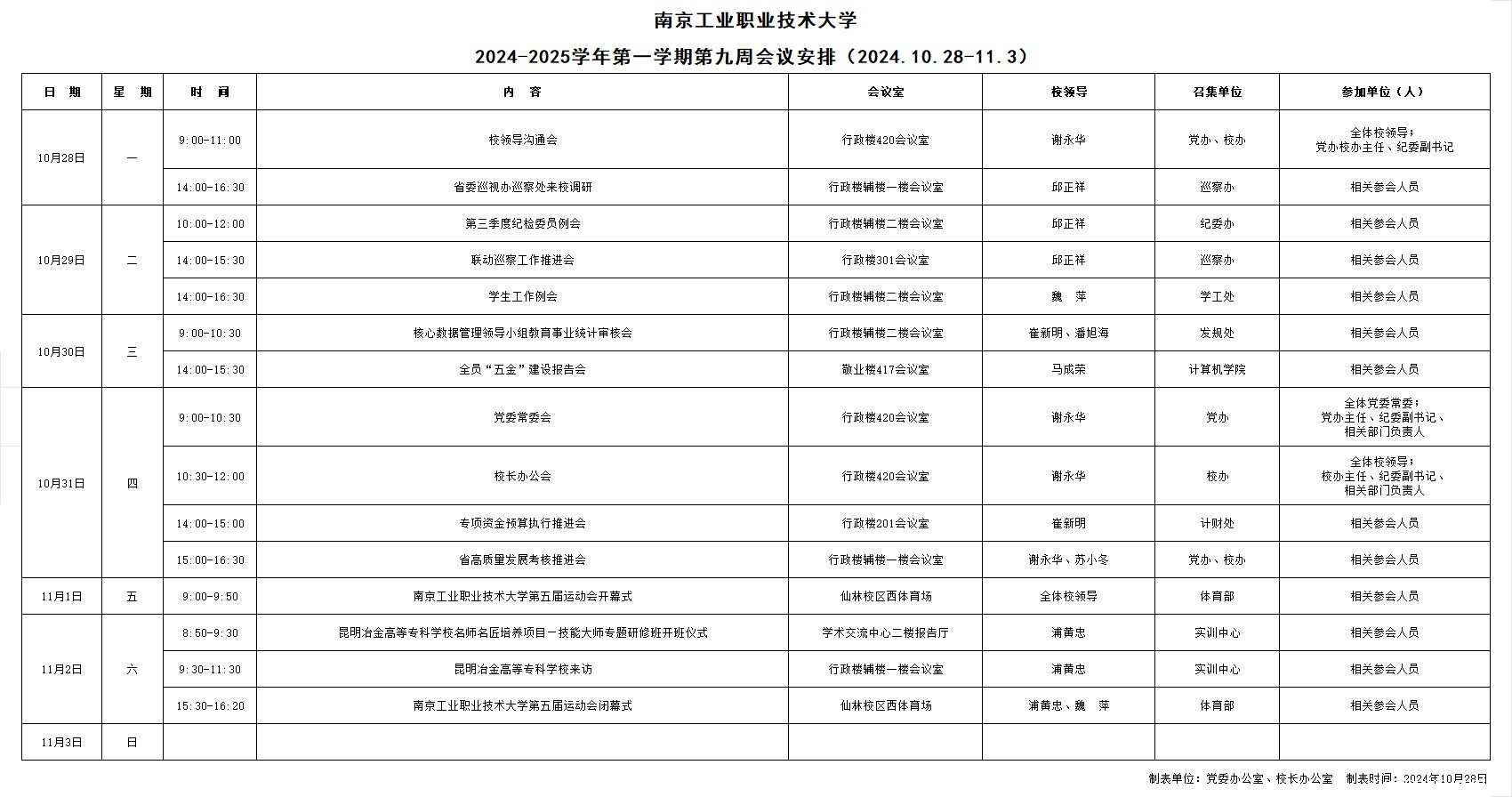 2024-2025学年第一学期第九周会议安排(2024.10.28-11.3)