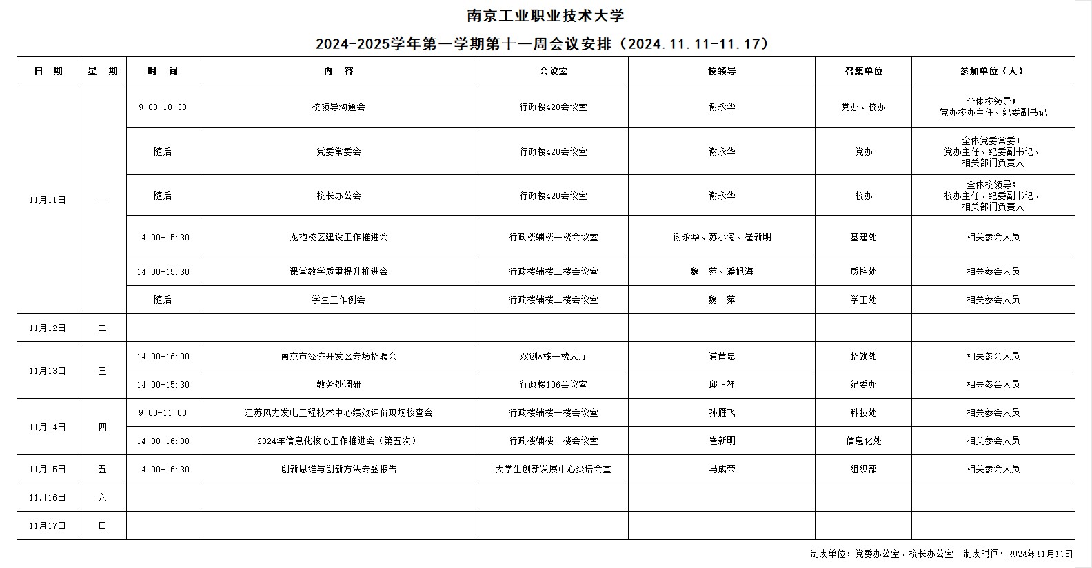 2024-2025学年第一学期第十一周会议安排(2024.11.11-11.17)