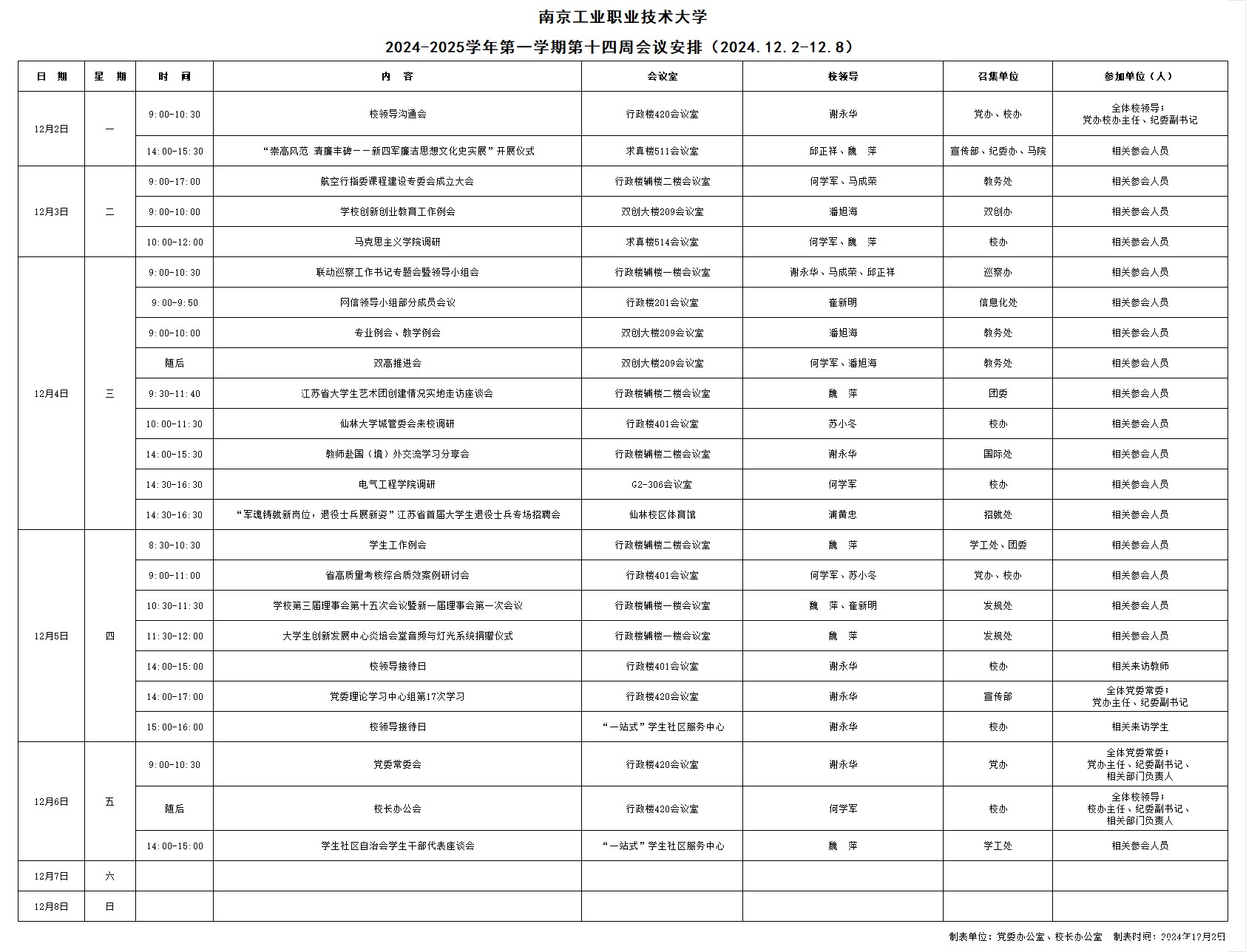 2024-2025学年第一学期第十四周会议安排(2024.12.2-12.8)