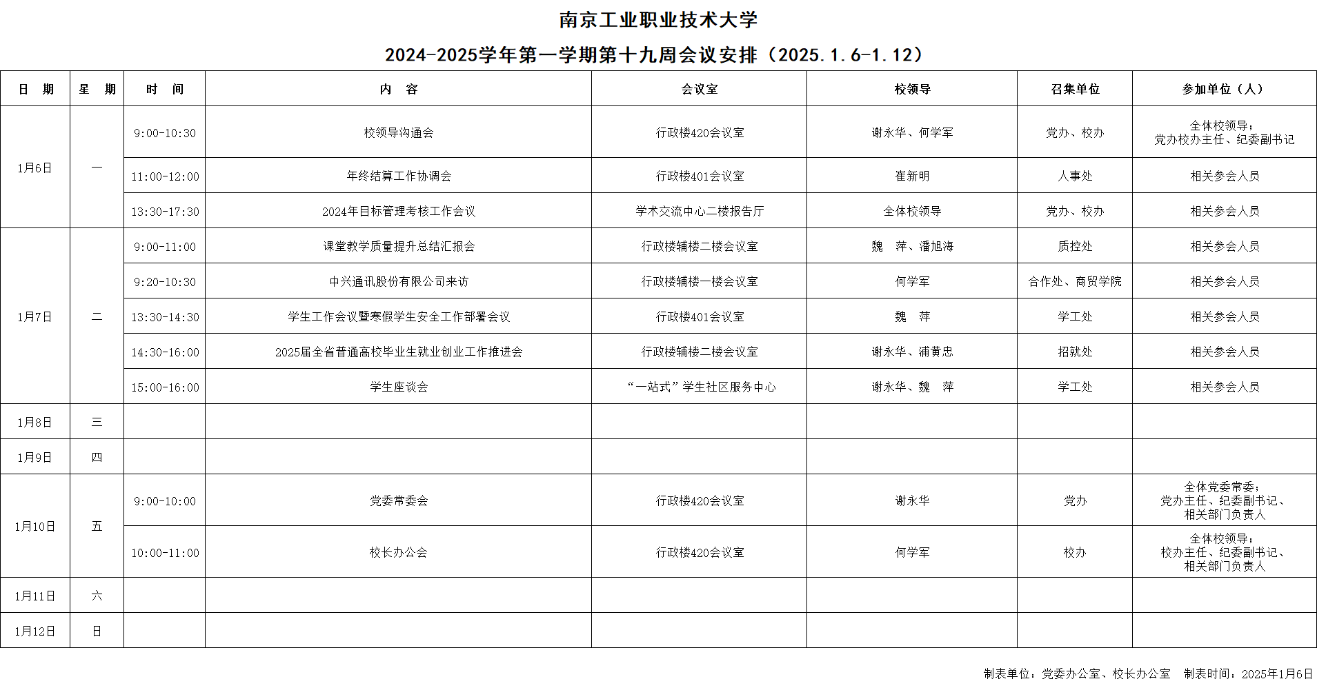 2024-2025学年第一学期第十九周会议安排(2025.1.6-1.12)