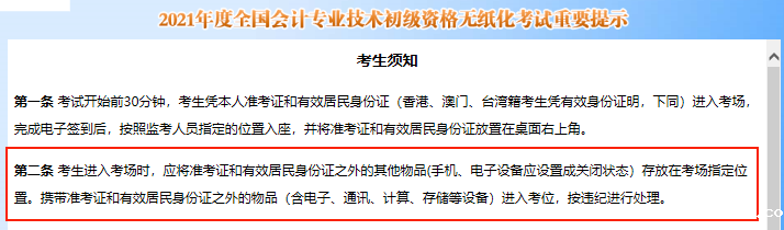 《全国会计专业技术资格无纸化考试考场规则》通知中指出:考试开始前30分钟,考生需要凭本人准考证和有效身份证件进入考场完成电子签到及身份校验,除此之外的其他物品(手机、电子设备应设置成关机状态)放入物品存放处。